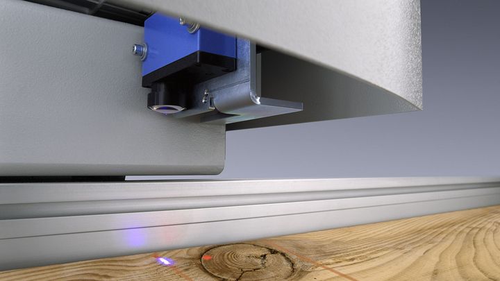 Before the saw control can start efficient optimization, it needs some data regarding the input material. The laser photocell enables automatic detection of the raw board length in order to subsequently calculate the cutting patterns for the best possible material yield. Also, its position on the pivoting pusher supports an efficient and continuous workflow, since the next material can be placed in the processing position during processing.